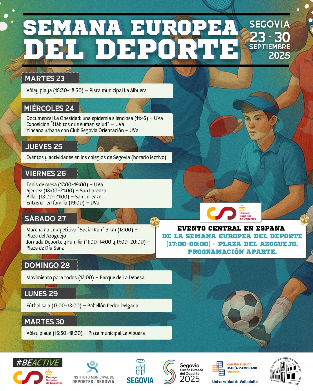 Segovia ha sido elegida como sede del evento central de la Semana Europea del Deporte a nivel nacional, que tendrá lugar el próximo sábado 27 de septiembre, de 17.00 a 00.00 horas, en el entorno del Azoguejo y la plaza de la Artillería.