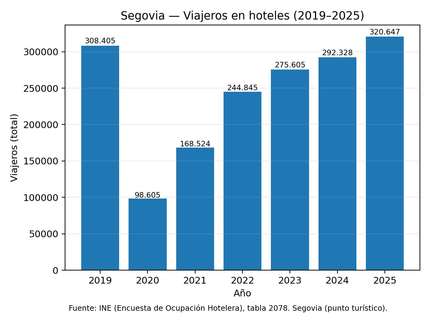 Segovia, 2 de febrero de 2026.El Instituto Nacional de Estadística (INE) ha publicado los datos de la Encuesta de ocupación hotelera correspondientes al mes de diciembre de 2025, lo que permite cerrar el balance anual y confirmar que Segovia ha vivido el mejor año turístico de su historia en términos de volumen de visitantes que pernoctan en la ciudad.