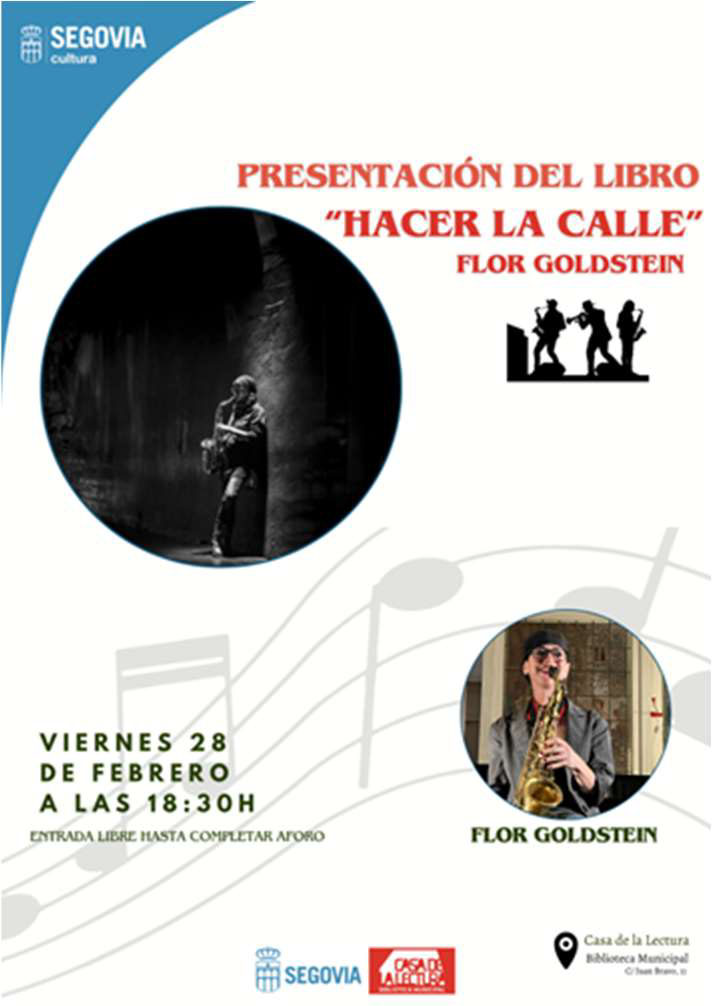 Flor Goldstein, saxofonista y escritora, nació en Buenos Aires y reside en España. Después de muchos años en los que su actividad musical se desarrolla en espacios formales, sale a tocar a la calle, y lo que allí descubre la enamora y le abre un mundo. Desde entonces, tanto a solas con su saxo, como en grupo junto a otros músicos, Flor sigue saliendo a la calle, descubriendo apasionadamente las muchas facetas que ésta le muestra, y escribiendo acerca de ello. “La calle es para mí un semillero de experiencias, n verdadero observatorio desde el cual me asomo a ver el mundo —y a mí misma— desde una perspectiva extrema y curiosa: exponiéndome, expongo el mundo que veo”. (Entrada libre hasta completar aforo