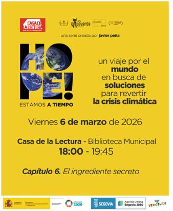 El Ayuntamiento de Segovia, a través de las áreas de Educación y Juventud y Agenda Urbana y Fondos Europeos, impulsa la proyección de la serie documental “Hope, estamos a tiempo” de Javier Peña. Documental que ofrece las claves para dar la vuelta a la emergencia climática.